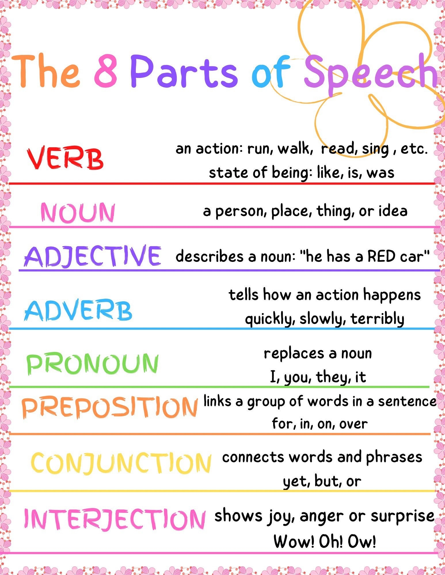 Are you looking for a fun and educational way to help your students or children learn about the parts of speech? Look no further! A printable 8 parts of speech chart is a fantastic resource to have on hand.